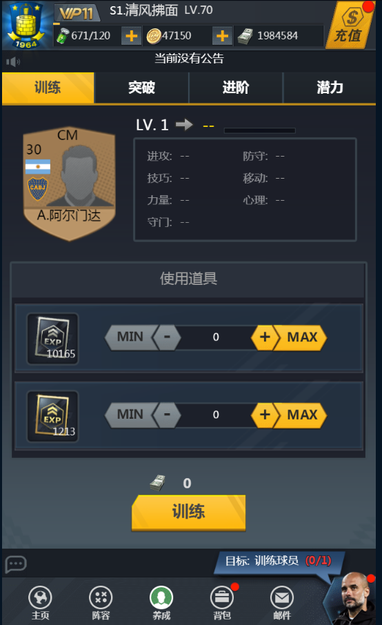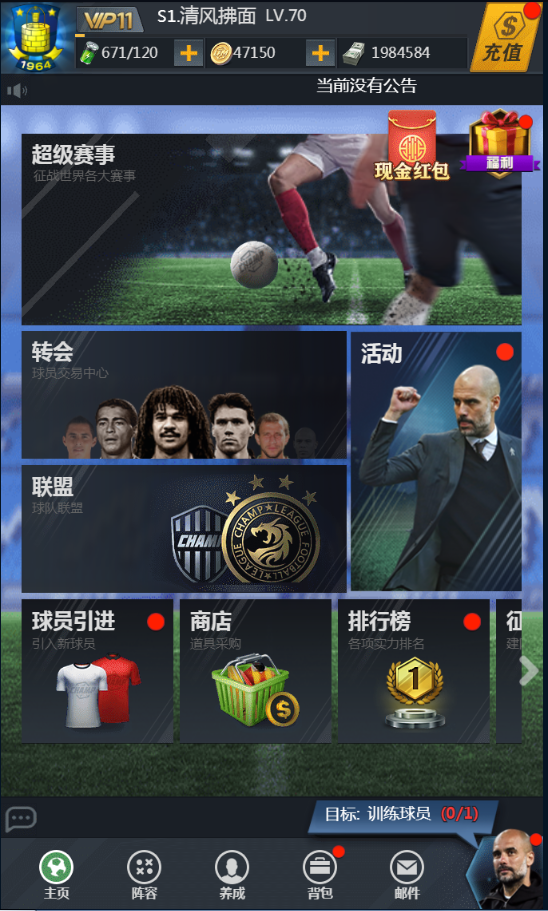 遊戲主界面是(shì)玩(wán)家(jiā)主要(yào)的(de)操作(zuò)入口,玩(wán)家(jiā)可(kě)以選擇任意一(yī)個(gè)功能(néng)進入,主界面上(shàng)方部分(fēn)是(shì)玩(wán)家(jiā)的(de)信息,包括俱樂(yuè)≤部隊徽、俱樂(yuè)部名、等級、金(jīn)币、資金(jīn)和(hé)體(tǐ)力。中間(jiān)部分(fēn)顯示玩(wán)家(jiā)當前擁有(yǒu)的(de)球員(yuán),還(háδi)有(yǒu)可(kě)操作(zuò)的(de)功能(néng),包括世界巡回賽、陣容、養成、背包和(hé)郵件(jiàn)。下(xià)方¥部分(fēn)為(wèi)功能(néng)的(de)快(kuài)速入口,每個(gè)界面都(dōu)有(yǒu)這(zhè)個(gè)快(kuài)速入口,玩(wán>)家(jiā)可(kě)以随時(shí)切換(圖1.1)
